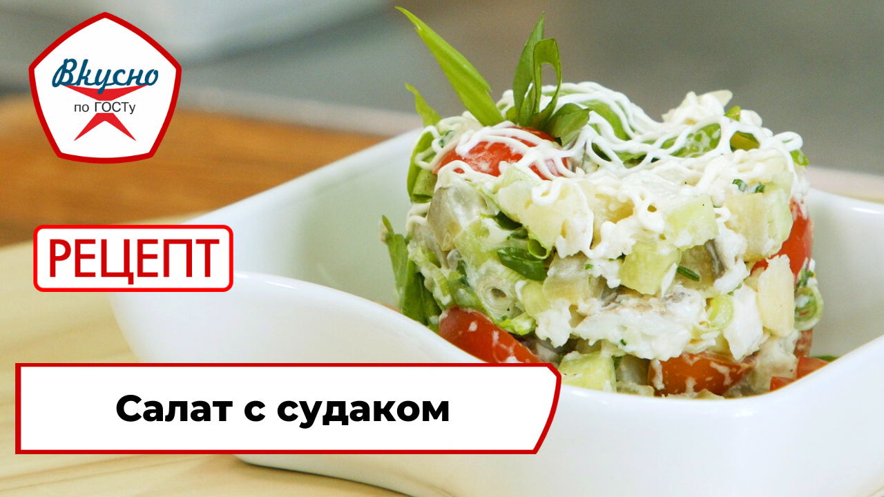 Салат с рыбой и овощами по рецепту из легендарной «Книги о вкусной и здоровой пище»! Попробуйте приготовить дома. Программа: «Вкусно по ГОСТу» – Рецепт – Салат с судаком.