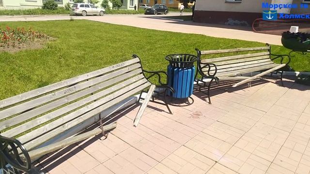 Плачевное состояние скамеек возле Центральной районной библиотеки города Холмск