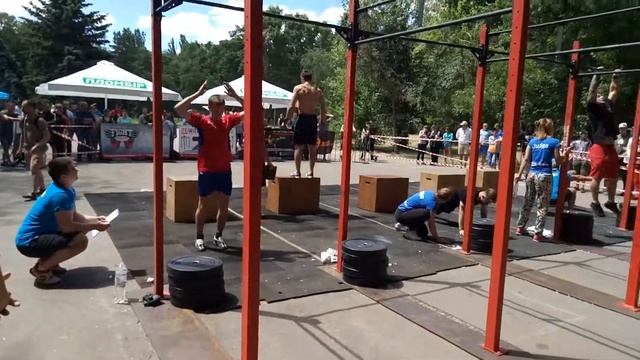 AMRAP 12 min. 15 прыжков на тумбу, 12 берпи, 9 носков к перекладине
