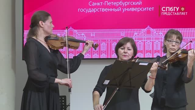 В актовом зале Здания Двенадцати коллегий прошел концерт камерной музыки. На сцене выступили музыканты камерного ансамбля Санкт-Петербургского университета и Гатчинского камерного оркестра, который, к слову, отметит в этом году своё 30-летие, а также студенты консерватории имени Римского-Корсакова. Открыл концерт ансамбль университета “La Scienza”, созданный в СПбГУ математиком и скрипачом Александром Флоринским. Автор - Юлия Виноградова