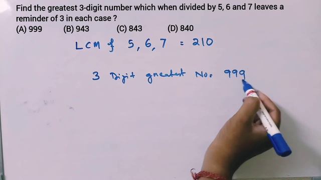 Find the greatest 3-digit number which when divided by 5, 6 and 7 leaves a reminder of 3 in each case ? (A) 999 (B) 943 (C) 843 (D) 840