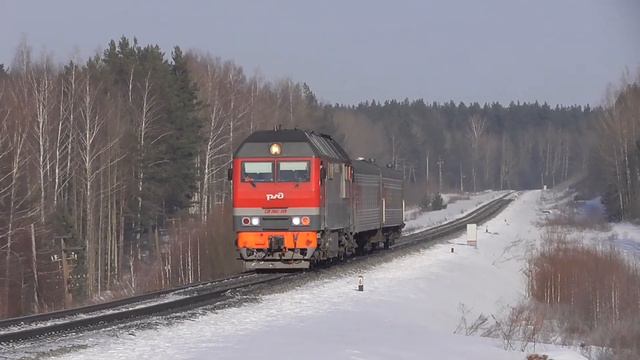 Магистральный тепловоз ТЭП70БС-289 во главе поезда № 6675 Ижевск-Нижнекамск следует по перегону Тихоново-Набережные челны 09.02.18. Приписан: Горьковская ж.д. тчэ-15 Агрыз.