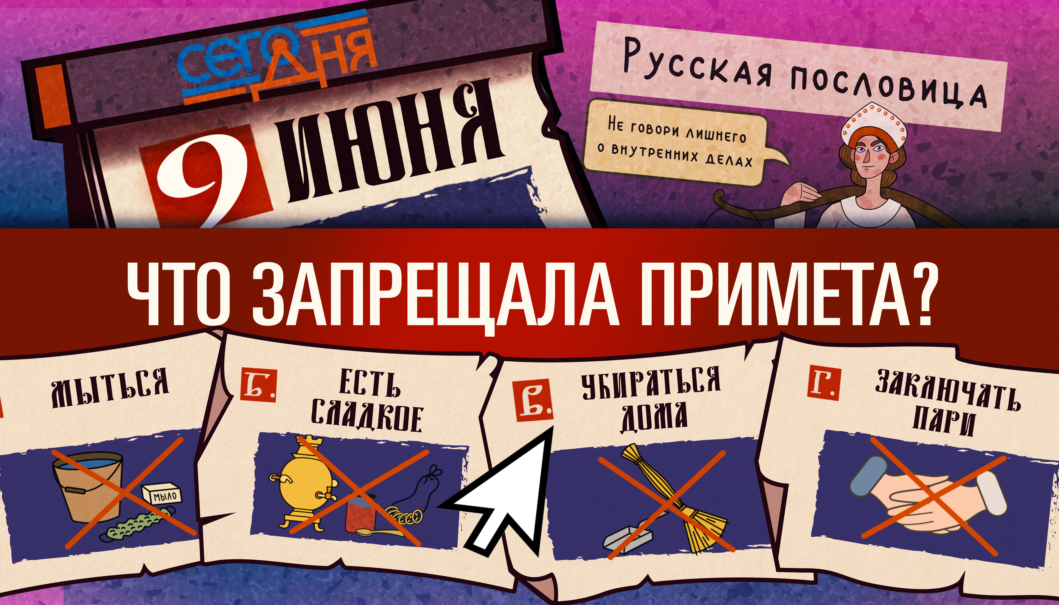 — С 9 июня связана русская народная примета, которая активно используется сегодня как пословица. Смысл пословицы: «не говорить лишнего о внутренних делах». Примета же запрещала определённое действие. Какое именно? — Сегодня международный день друзей! Отличный повод собраться! Отгадай, что случилось «Сего дня»!