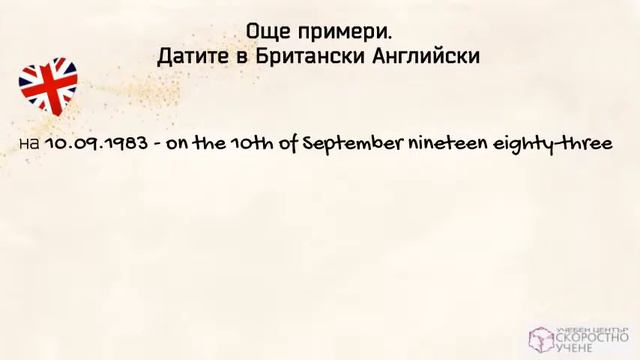 Как да изговаряте датите на Английски език. Граматика. Онлайн Самоучител. Уроци по Английски език. Научете как да изговаряте датите на Английски език: https://www.acc-learn.com/blog-post/%d0%ba%d0%b0%d0%ba-%d0%b4%d0%b0-%d0%ba%d0%b0%d0%b6%d0%b5%d1%82%d0%b5-%d0%b4%d0%b0%d1%82%d0%b8%d1%82%d0%b5-%d0%b8-%d0%b3%d0%be%d0%b4%d0%b8%d0%bd%d0%b8%d1%82%d0%b5-%d0%b2-%d0%b0%d0%bd%d0%b3%d0%bb%d0%b8/ Онлайн Английки език за възрастни-Индивидуално: https://www.acc-learn.com/1000words-%d1%83%d1%87%d0%b5%d0%b1%d0%b5%d0%bd-%d1%86%d0%b5%d0%bd%d1%82%d1%8a%d1%80/ Онлайн Английски за възрастни-В група: https://www.acc-learn.com/%D0%B0%D0%BD%D0%B3%D0%BB%D0%B8%D0%B9%D1%81%D0%BA%D0%B8-%D0%B5%D0%B7%D0%B8%D0%BA-%D0%BE%D0%BD%D0%BB%D0%B0%D0%B9%D0%BD-%D0%B3%D1%80%D1%83%D0%BF%D0%BE%D0%B2%D0%B8-%D0%BA%D1%83%D1%80%D1%81%D0%BE%D0%B2/ Онлайн Английски език за деца: https://www.acc-learn.com/blog-post/%d0%be%d0%bd%d0%bb%d0%b0%d0%b9%d0%bd-%d0%ba%d1%83%d1%80%d1%81-%d0%bf%d0%be-%d0%b0%d0%bd%d0%b3%d0%bb%d0%b8%d0%b9%d1%81%d0%ba%d0%b8-%d0%b5%d0%b7%d0%b8%d0%ba-%d0%b7%d0%b0-%d0%b4%d0%b5%d1%86%d0%b0-%d0%b8/ Английска Граматика: https://www.acc-learn.com/blog-post/%D0%B0%D0%BD%D0%B3%D0%BB%D0%B8%D0%B9%D1%81%D0%BA%D0%B0-%D0%B3%D1%80%D0%B0%D0%BC%D0%B0%D1%82%D0%B8%D0%BA%D0%B0/ Ние в Учебен Център "Скоростно Учене" правим ученето на английски език лесно и приятно занимание, в гъвкав график, съобразен с Вашето свободно време. Уроците са индивидуални или групови чрез видеовръзка с преподавател. Ще изградите лична връзка с преподавателя и ще напредвате точно според темпа, оптимален за Вашето ефективно и бързо усвояване на английски език. Ние следваме стандартите, заложени в Европейската Езикова Рамка, така че може да сте уверени, че Вашите умения ще са разпознаваеми на интернационално ниво!