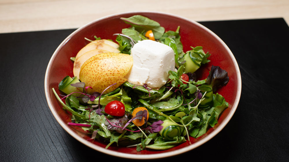 Зелёный салат с медовым соусом и козьим сыром. Итальянская полента с сыром. Марочино