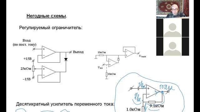 6 лекция, часть 1, Искусство схемотехники, СПбГУ, 2021, Крылов И. Р., негодные схемы на операционных усилителях: регулируемый ограничитель, десятикратный усилитель переменного тока, генератор треугольных колебаний с регулируемой частотой.