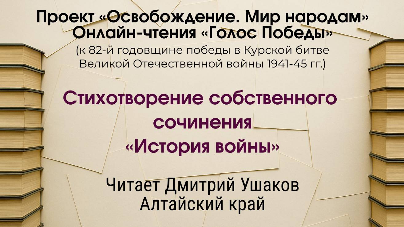 Проект «Освобождение. Мир народам» Онлайн-чтения «Голос Победы» (к 82-й годовщине победы в Курской битве Великой Отечественной войны 1941-45 гг.) Стихотворение собственного сочинения «История войны» Читает Дмитрий Ушаков Алтайский край Наш официальный сайт: okean.org