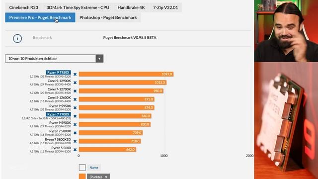 Ryzen 7000 BENCHMARKS | 9 7950X und 7 7700X im Test ▶ Ryzen 7000 ist 60 Prozent schneller als Alder Lake und 50 Prozent effizienter - so wurde der Launch von PCGH zu Zen 4 eingeläutet. Wir liefern Euch jetzt das Ergebnis von über 4.000 Messungen in Form des neuen CPU-Index, der alle Vorteile der neuesten CPU-Generationen, wie DDR5 und PCI-Express 5.0 berücksichtigt. Wie schnell ist Zen 4, Codename Raphael? PCGH-Artikel zum Video-Beitrag: ▶ AMD Ryzen 9 7950X und Ryzen 7 7700X im Test: Die Kerne der Zukunft: http://www.pcgh.de/aid,1403987 Timestamps: 0:30 Spec-Vergleich 1:24 Spiele Benchmarks 6:21 Anwendungs-Benchmarks 11:29 Overclocking und Undervolting Benchmarks 11:52 Leistungsaufnahme und Effizienz 14:13 Fazit Die neuesten ▶ Gaming-Monitore*: http://amzn.to/2ttcJiW ▶ Gaming-Headsets*: http://amzn.to/2sPKQQx ▶ Gaming-Tastaturen*: http://amzn.to/2sPD9d6 ▶ Gaming-Mäuse*: http://amzn.to/2tPCgVJ ▶ Gaming-Mainboards*: http://amzn.to/2sPprH8 PC Games Hardware: ▶ Mehr News bei PCGH: http:/www.pcgh.de/news ▶ Helft uns mit Amazon-Käufen*: http://amzn.to/2sPzv2w ▶ PCGH Webseite: http://www.pcgh.de ▶ PCGH @ Discord: https://discord.gg/pcgh ▶ PCGH @ Facebook: https://www.facebook.com/pcgameshardware/ ▶ PCGH @ Twitter: https://twitter.com/PCGH_Redaktion ▶ PCGH @ Instagram: https://www.instagram.com/pcgh.de/ ▶ PCGH @ Youtube: https://www.youtube.com/c/PCGamesHardware ▶ Frag PCGH per Mail: leserpost@pcgameshardware.de (*) Affiliate-Links haben wir mit einem Sternchen gekennzeichnet. Wir erhalten für einen Kauf über unseren Link eine kleine Provision und können so die kostenlosen Videos teilweise mit diesen Einnahmen finanzieren. Für den User entstehen hierbei keine Kosten. #pcgh #Ryzen7000 #hardware