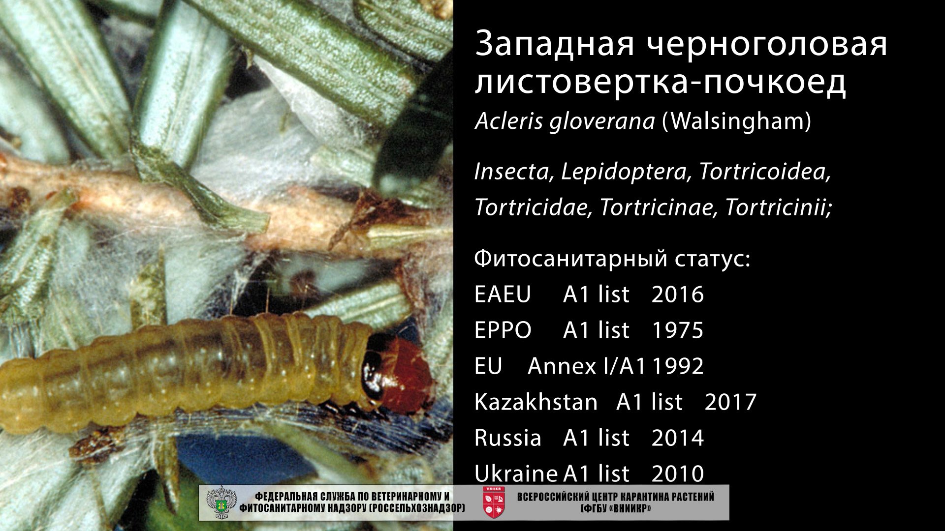 Западная черноголовая листовёртка-почкоед, Acleris gloverana - опасный вредитель хвойных древесных растений в Северной Америке. Заселяет пихту бальзамическую, тсугу и пихту, ель, лиственницу американскую.