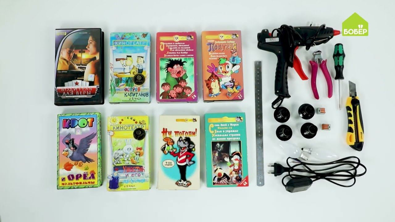 Делаем своими руками креативную лампу в стиле поп-арт. Видеокассеты + линейка + кусачки + клеевой пистолет + патроны + электрический провод + клеммы + отвёртка + нож + лампочки = Настольная лампа из видеокассет. Подписывайтесь на наш канал, чтобы узнать еще больше полезного и интересного → https://vk.cc/cas1F5 Сайт → https://bober.ru?utm_source=youtube Телеграм → https://t.me/boberru VK → https://vk.com/bobertk OK → https://ok.ru/tvbober TikTok → https://www.tiktok.com/@bober_ru