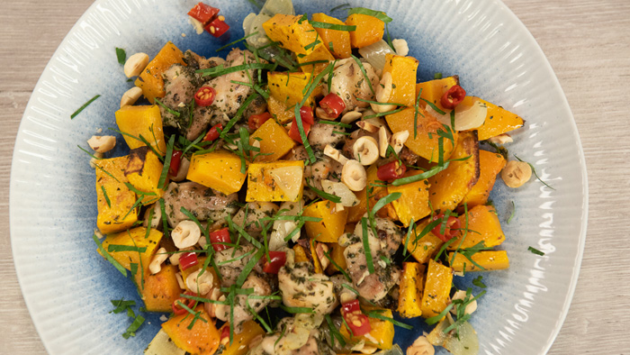 Запеченная тыква с кусочками курицы. Салат из тыквы с семечками