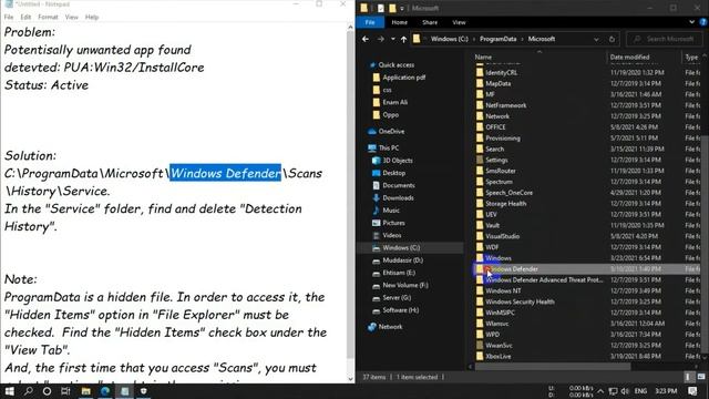 Problem: Potentisally unwanted app found detevted: PUA:Win32/InstallCore Status: Active Solution: C:\ProgramData\Microsoft\Windows Defender\Scans\History\Service. In the "Service" folder, find and delete "Detection History". Note: ProgramData is a hidden file. In order to access it, the "Hidden Items" option in "File Explorer" must be checked. Find the "Hidden Items" check box under the "View Tab". And, the first time that you access "Scans", you must select "continue", to obtain the permission. #PAU #Potentisally_unwanted_app #PAU_error #PAU_Solve