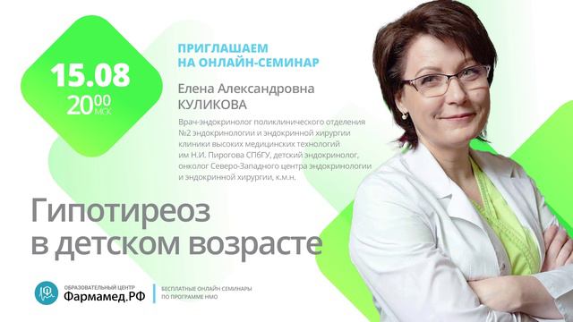 15 августа 2024 г. в 20-00 врач-эндокринолог Куликова Е.А. приглашает на бесплатный семинар НМО "Гипотиреоз в детском возрасте". Регистрация на семинар: https://obrfm.ru/info/FB8863/