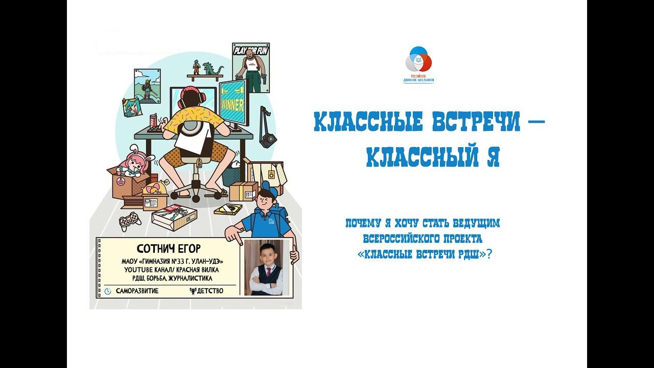 Российское движение школьников | РДШ ищет новых ведущих на свой Всероссийский проект Классные встречи РДШ. Я, Егор Сотнич, активист РДШ | Республика Бурятия в деле! В ролике рассказ обо мне, моих достижениях в проекте «Классные встречи РДШ», а также ответ на вопрос: «Почему я должен стать ведущим Классных встреч?». Вперед, урагша - вместе с РДШ! #РДШ #КлассныеВстречиРДШ #КлассныйВедущийРДШ #КраснаяВилка #СотничЕгор #рдш03 #форусрб03 #manrb03 #гимназия33уу