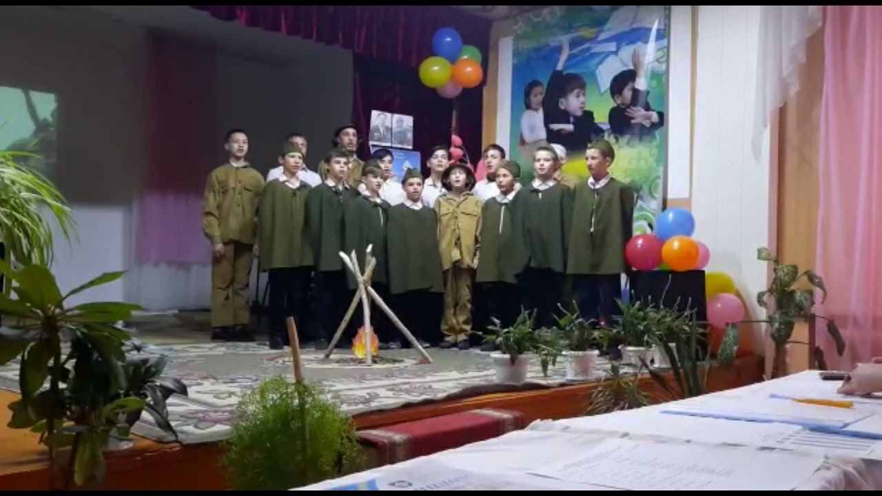Смирнов Александр, Кремер Сергей, Чистяков Алексей, Какенов Анатолий, 12-16 лет, КГУ «Мамлютская санаторная средняя школа-интернат», Республика Казахстан, СКО, Мамлютский район, г.Мамлютка, рук. Турсунова Алия Серикбаевна исполняют песню «О той весне!». Текст песни Кино идет — Воюет взвод. Далекий год На пленке старой. Нелегкий путь — Еще чуть-чуть И догорят Войны пожары. Счастливый май!.. Любимый край, Своих солдат Встречай скорее! От ран, обид Земля дрожит. Теплом души Ее согреем! И все о той весне Увидел я во сне. Пришёл рассвет и миру улыбнулся, — Что вьюга отмела, Что верба расцвела И прадед мой с войны домой вернулся!.. В лихом бою В чужом краю Пусть берегут Любовь и вера, Чтоб больше их Пришло живых — И рядовых, И офицеров. Придут весной, Как прадед мой, И в дом родной Откроют двери. Я помню свет Далеких лет. В свою страну Я буду верить! И все о той весне Увидел я во сне. Пришёл рассвет и миру улыбнулся, — Что вьюга отмела, Что верба расцвела И прадед мой с войны домой вернулся!..