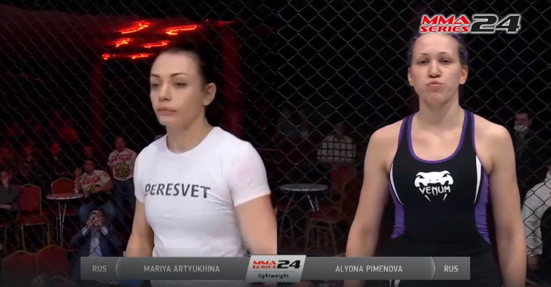 Турнир: ММА Серия-24 Город проведения турнира: Уфа Боец синего угла: Мария Артюхина (Россия) Боец красного угла: Алена Пименова (Россия) Победитель: Мария Артюхина Способ победы: Единогласное решение судей