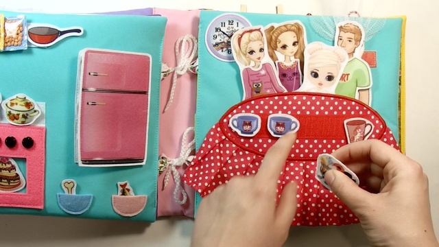 Крупная книга-дом с семьёй кукол. Куклы: мама, папа, старшая и младшая дочки.