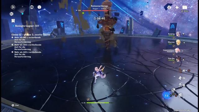Scuffed artefacts on characters because more EM needed with new Dendro reactions. Also no 4-piece-set of the new Dendro artefacts for Dendro Res shred. Still managed to get a 3-star clear, but it was more annoying then it should have been. Team 1: Beidou C6 @Gravestone, Collei C0 @BP Bow, Kuki C0 @Jadecutter, Kazuha C0 @Freedom Sworn Team 2: Keqing C1 @Mistsplitter, D-Lumine C2 @Skyward, Kokomi C0 @Hakushin, Yunjin C1 @Favonius