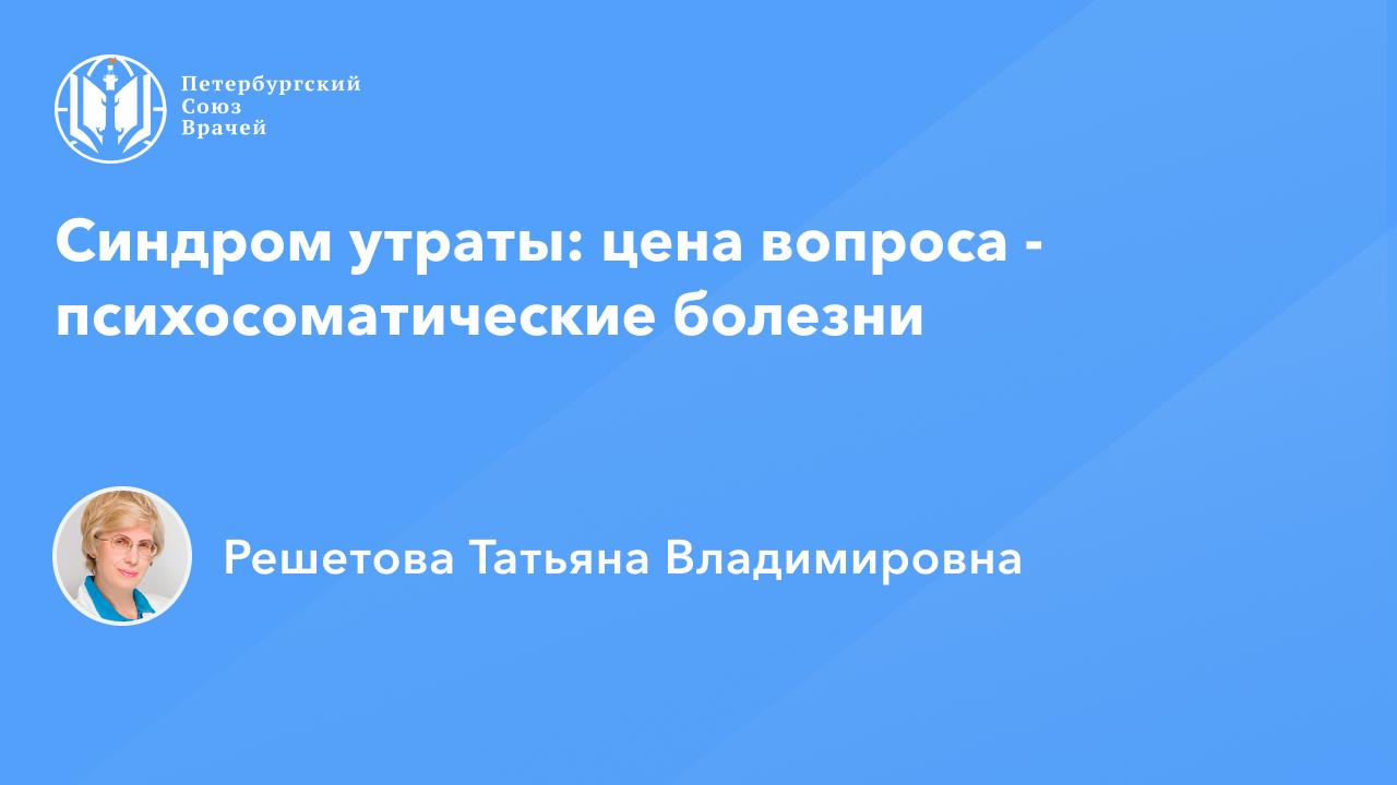 Синдром утраты: цена вопроса - психосоматические болезни Сайт: www.spb.doctor Дата проведения: 18.04.2024, 20:00 Страница мероприятия: https://spb.doctor/i/240418/ Программа: 1. 00:00:03 Синдром утраты: цена вопроса - психосоматические болезни. Решетова Татьяна Владимировна 2. 01:40:33 Ответы на вопросы О семинаре: В онлайн-семинаре будут подробно рассмотрены особенности формирования, течения, клиника, диагностика на разных стадиях депрессии утраты - самой частой депрессии в общей медицинской практике. Будут освещены механизмы формирования психосоматических расстройств вообще и конкретно после утраты. Будут представлены особенности разнообразных проявлений синдрома утраты в соматической, когнитивной, эмоциональной сферах, вегетодистонические и другие признаки, проанализированы различные возможности психофармакотерапии и психологической поддержки, доступной врачу общей практики.