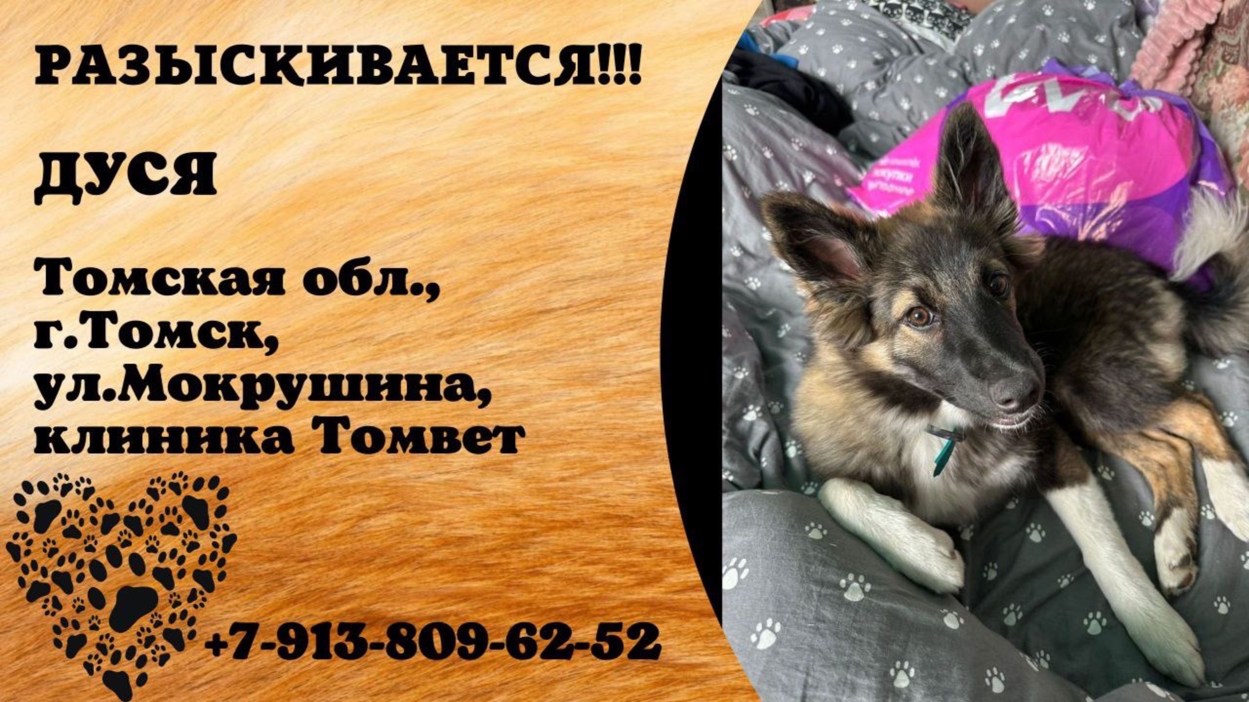 Томская Томск Пропала собака ПОТЕРЯЛАСЬ СОБАКА Томск. Ул. Мокрушина. Около клиники Томвет, испугалась шума, вывернулась из ошейника и убежала. Потерялась 9 июня примерно в 21:30. Собака в стрессе. Напугана. Город не знает. Местность незнакомая. Может находиться уже в любой другой точке города. Звать Дуся. Среднего размера, около 15кг. Приметы: хвост закрученный, с белым конечиком. На передних лапках белые гольфики, на задних лапках носочки. Достаточно пушистая Кто увидит, позвоните сразу по телефону. Звонить в любое время дня и ночи. Полина Юлия Если Вы нашли собаку просьба вернуть за вознаграждение! МАКСИМАЛЬНЫЙ РЕПОСТ! Распространите, пожалуйста информацию Имя хозяина: Полина Телефон: 79138096252 Инфо: https://vk.com/wall-198815410_202316 #пропала_собака#томск