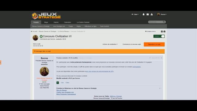 Bonjour et merci pour avoir regarder cette petite vidéo annonce: pour participer c'est tout simple il suffit de suivre ce lien : http://forum.reseau-js.com/topic/94087-concours-civilization-vi Le jeu chez notre partenaire : https://fr.gamesplanet.com/game/sid-meier-s-civilization-vi-steam-key--3031-1?ref=RJS