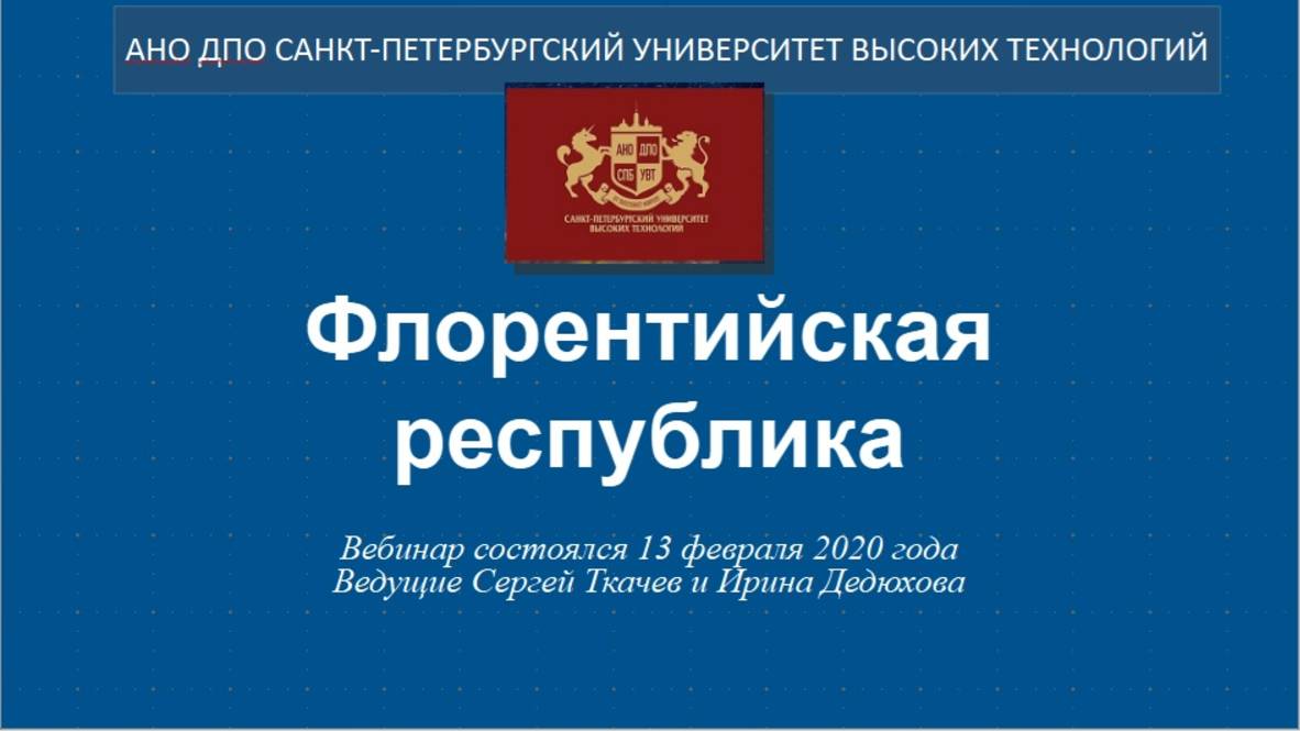 Флорентийская республика (2020) Второй вебинар Книжной лавки на эту тему состоялся 13.02.2020 г. Ведущие — Ирина Дедюхова и Сергей Ткачев. Видео материал к вебинару, вырезан из ролика из-за ограничения по времени - http://my.mail.ru/mail/al3101961/video/11/995.html Смотреть/читать по теме: Флорентийская республика. https://ogurcova-portal.com/florentiyskaya-respublika/ (2015/2020) Первый вебинар 2016 года - https://home.strannik-j.org/video/619281961eb0c10541f403ab14399022/ Источники: Научно-технический портал «Технарь» https://ogurcova-online.com/ "Книжная лавка" https://ogurcova-portal.com/ "Литературное обозрение" https://litobozrenie.com/ Вебинар разработан и проведен в рамках образовательных программ АНО ДПО СПБ УВТ - Санкт-Петербургский университет высоких технологий https://univer.spb.ru/ в соответствии с законодательством об образовательной деятельности в РФ N 273-ФЗ по лицензии №3911 Комитета по образованию Правительства СПб https://univer.spb.ru/wp-content/uploads/2019/12/license015small-1.jpg