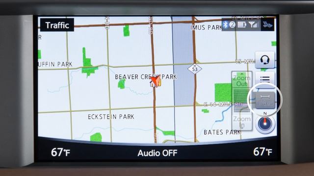 "This video is copyrighted material of Nissan North America, Inc. and should not be copied, edited, or reproduced without the permission of Nissan. The MAP/VOICE button is located near the INFINITI Controller on the center console. Press it to display a map of the current vehicle location. Maps can be displayed in 2D view, which shows a map in the two dimensional form that is similar to a road map, or in BIRDVIEW, a three-dimensional map that makes a route more recognizable because it elevates the landmarks and provides a panoramic view over a long distance. To switch between map views, touch this key. In 2D view, the map can be oriented to have the top of the screen represent north or the direction the vehicle is heading. Touching the screen and releasing re-centers the map at the touched location. When in 3D mode, this also displays touch icons for rotating the map view. Touching and holding the map screen in all map views scrolls the map in the direction that is touched. The map can also be moved with a drag or flick motion. For quicker moving of the map screen, you can touch and then drag a map in any direction, regardless of view mode. Additionally, you can use a quick swiping gesture to engage a faster scroll of the map. The INFINITI Controller can be used to move the map by sliding the controller in any direction. To zoom in or out, touch this scale indicator on the right side of the map screen or turn the INFINITI controller left or right. You can also zoom the map by touching the screen with a “pinch in” motion to zoom in or a “pinch out” motion to zoom out. With the current map location shown on the screen, press and release the MAP/ VOICE button to show the DISPLAY VIEW BAR. You can use the touchscreen or INFINITI controller to select an item in the DISPLAY VIEW BAR. Select from a variety of split screen map views, or touch the right arrow to scroll for additional options to display on the left side of the split screen view, including: ● SPLIT MAP, to choose from a variety of split map view options, ● INTERSECTION, which displays a map of the upcoming intersection on the left side of the split screen view, ● TURN LIST, to view a list of turns on the current route, ● WHERE AM I?, to show information about the current vehicle location, ● TURN-BY-TURN, which displays turn information for the current route guidance, and ● ECO DRIVE REPORT, to see a breakdown of how economically the vehicle is being driven. Some DISPLAY VIEW BAR options can only be selected after touching the arrow icon to scroll for additional options. Please see your Navigation System Owner’s Manual for important safety information, system limitations and additional operating information. "