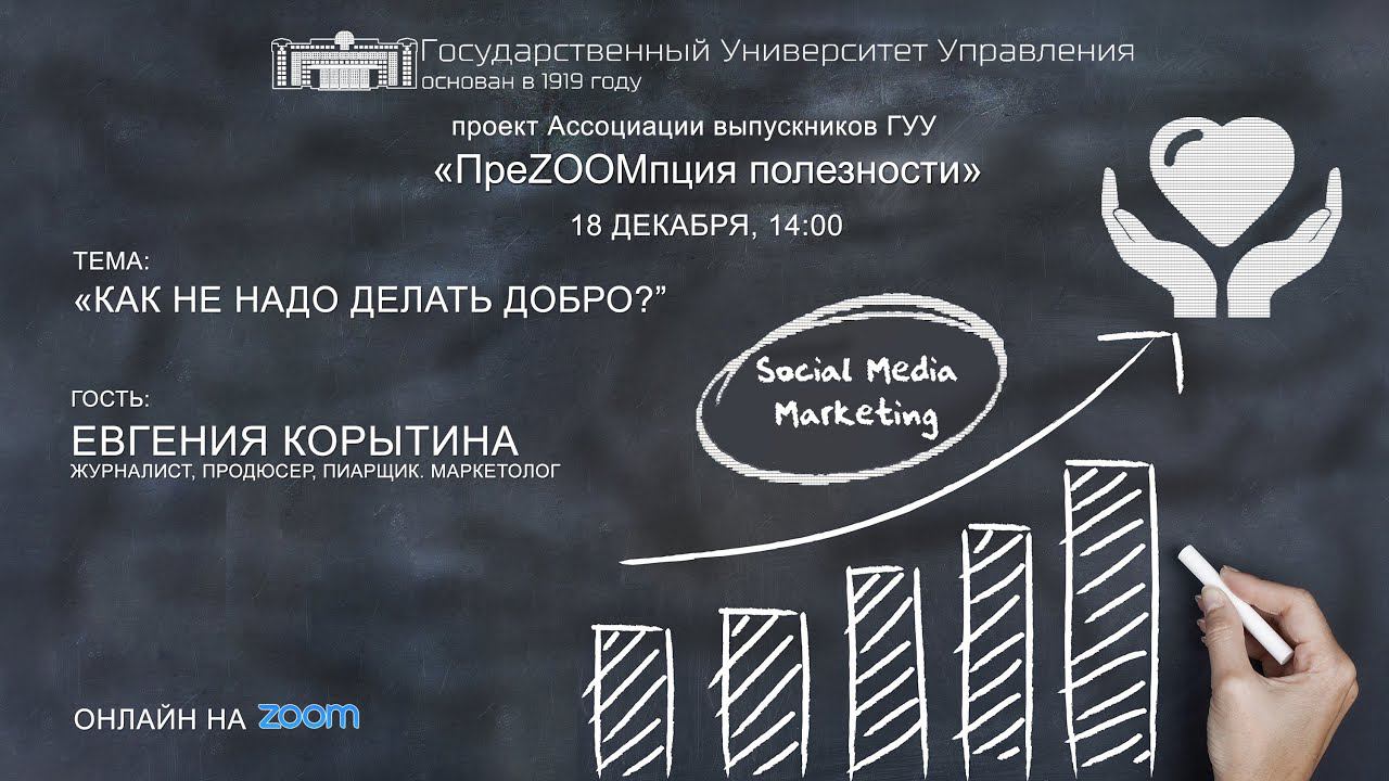 Сегодня на нашем официальном канале в ютуб вышла финальная серия второго сезона #ПреZOOMпции полезности, съемка которой состоялась 18 декабря. Тема выпуска: «Как не надо делать добро» Спикер: Евгения Корытина – выпускница ГУУ, журналист, продюсер, пиарщик, маркетолог. Евгения пишет о системной благотворительности, ведет telegram-канал #причини_добро, а также является спикером «Московский школы профессиональной филантропии». В преддверии Нового года гостья программы расскажет слушателям как в предновогодней суете, желая сделать добро, не нарваться на мошенников. А также о том, как правильно, а самое главное эффективно творить добро, добиваясь максимальной пользы от своей благотворительной деятельности.
