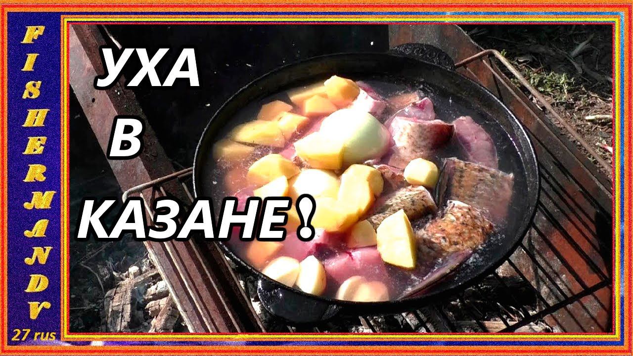 Двойная уха в казане из четырёх видов рыбы на костре, уха от fisherman dv 27 rus