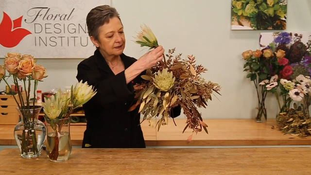 To learn more, enroll in Basic Floral Design Online: https://www.floraldesigninstitute.com/new-basic-floral-design-online.html In this video how-to demonstration Leanne creates an amazing wedding bouquet combining fabulous fresh flowers and dried flowers all from FiftyFlowers.com. The crescent style hand-tied bouquet is built upon a chicken wire armature and features white protea, roses, anemones, dried and bleached flowers and enhanced with a collar of metallic copper and gold foliages. You will love this gorgeous bouquet. Enjoy! ! Sign up for our free weekly email for additional floral design demonstrations: https://www.floraldesigninstitute.com/newsletter-signup.html