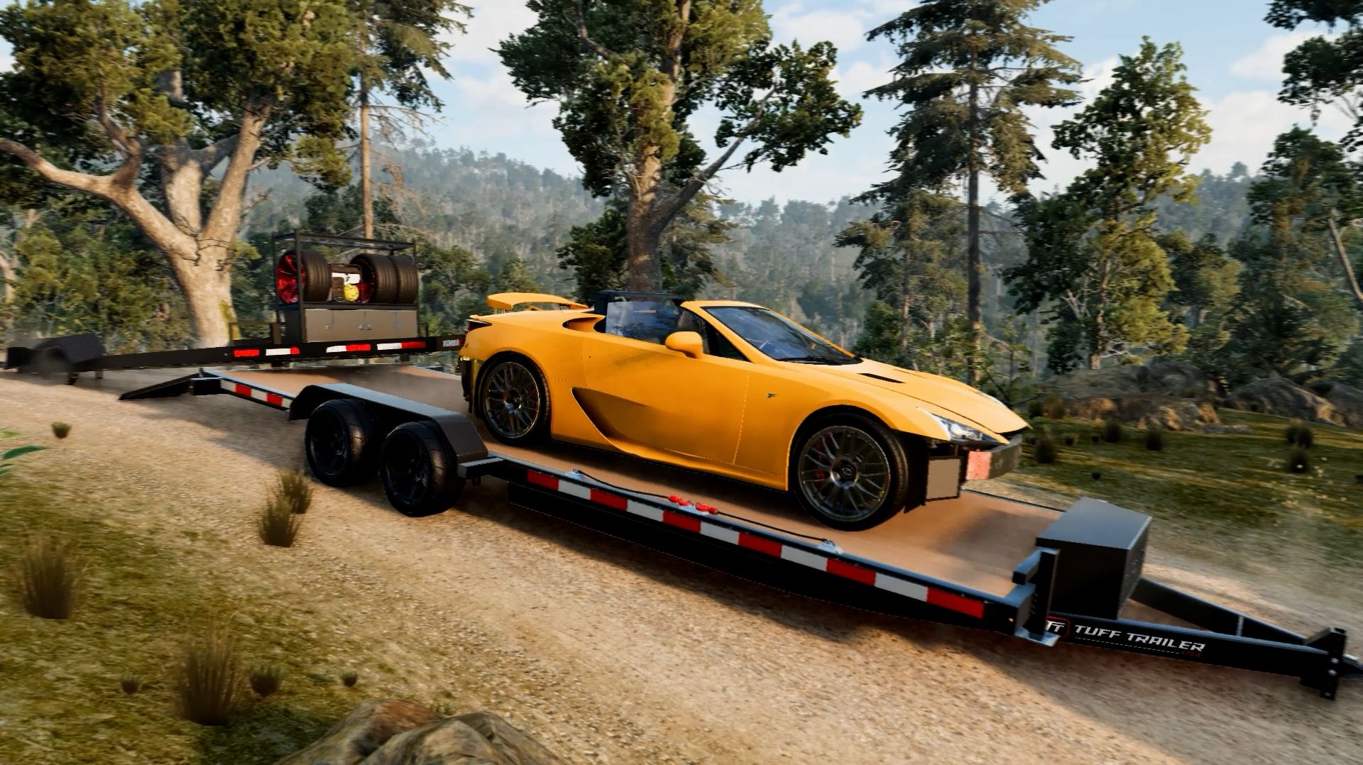 Машина-эвакуатор перевозила другую машину по лесной дороге. В какой-то момент машинка увлеклась и набрала скорость. Прицеп эвакуатора занесло, и он потерял перевозимую машинку и сам ударился в дерево. На помощь эвакуатору пришел другой эвакуатор.