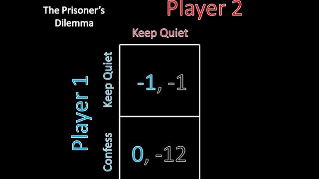Game Theory 101: The Complete Textbook on Amazon: https://www.amazon.com/Game-Theory-101-Complete-Textbook/dp/1492728152/ http://gametheory101.com/courses/game-theory-101/ Two prisoners are locked into separate interrogation rooms. The cops know they were trespassing and believe they were planning on robbing a store, but they lack sufficient evidence to charge them with the latter crime. Thus, they offer the prisoners the following deal: If no one confesses, both will only be charged with trespassing and receive a sentence of one month. If one confesses while the other keeps quiet, the confessor will get to walk away free, while the one who kept quiet will be charged to the fullest extent of the law--twelve months in jail. Finally, if both confess, each criminal's testimony is less useful, and both will be locked up for eight months. If each prisoner only want to minimize the amount of time he spends in jail, what should they do? This lesson introduces the concept of strict dominance, which is a very useful tool for a game theorist.
