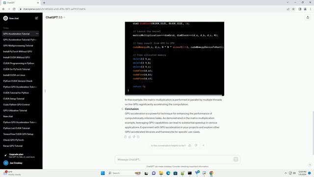 Download this code from https://codegive.com Title: Harnessing the Power of GPU Acceleration in Your Applications Introduction: Graphics Processing Units (GPUs) are powerful hardware components designed to accelerate graphics rendering. However, their parallel processing capabilities make them suitable for a wide range of general-purpose computing tasks. In this tutorial, we'll explore the benefits of GPU acceleration and provide code examples using popular programming languages. Understanding GPU Acceleration: GPU acceleration involves offloading computation tasks from the CPU to the GPU, leveraging its parallel processing architecture. This can significantly boost performance for tasks that can be parallelized, such as matrix operations, image processing, and scientific simulations. Selecting a GPU-Accelerated Programming Language: Choose a programming language that supports GPU acceleration. Common choices include CUDA (NVIDIA GPUs), OpenCL (platform-independent), and libraries like OpenACC. Setting Up the Development Environment: Ensure you have the necessary tools installed for GPU development. For CUDA, you'll need the NVIDIA CUDA Toolkit. For OpenCL, install the appropriate SDK for your platform. GPU-Accelerated Matrix Multiplication Example (CUDA): Let's dive into a simple example of matrix multiplication using CUDA in C++. First, you need to define the matrix dimensions and allocate memory on both the CPU and GPU. In this example, the matrix multiplication is performed in parallel by multiple threads on the GPU, significantly accelerating the computation. Conclusion: GPU acceleration is a powerful technique for enhancing the performance of computationally intensive tasks. As demonstrated in the matrix multiplication example, leveraging GPU capabilities can lead to substantial speedup in various applications. Experiment with GPU acceleration in your projects and explore other GPU-accelerated libraries and frameworks for specific use cases. ChatGPT