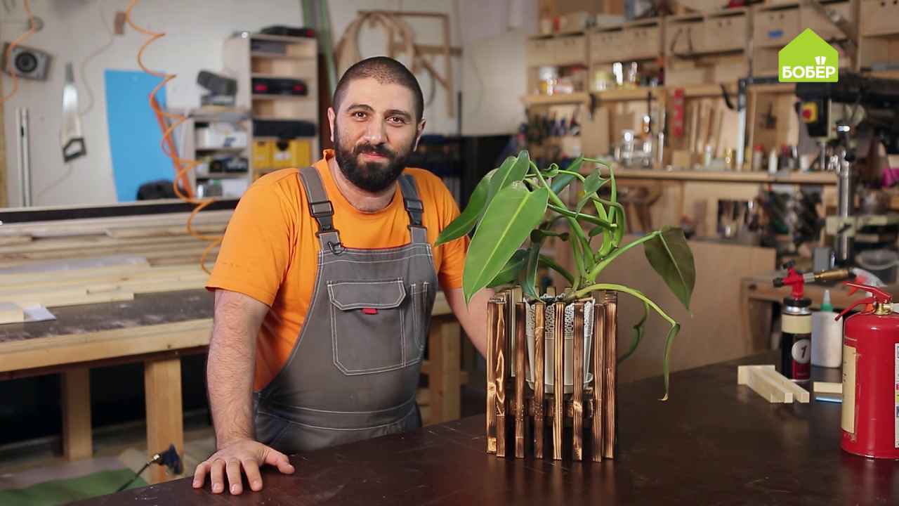 Брутальное кашпо из обожжённых деревянных реек. Как сделать стильный горшок для дома