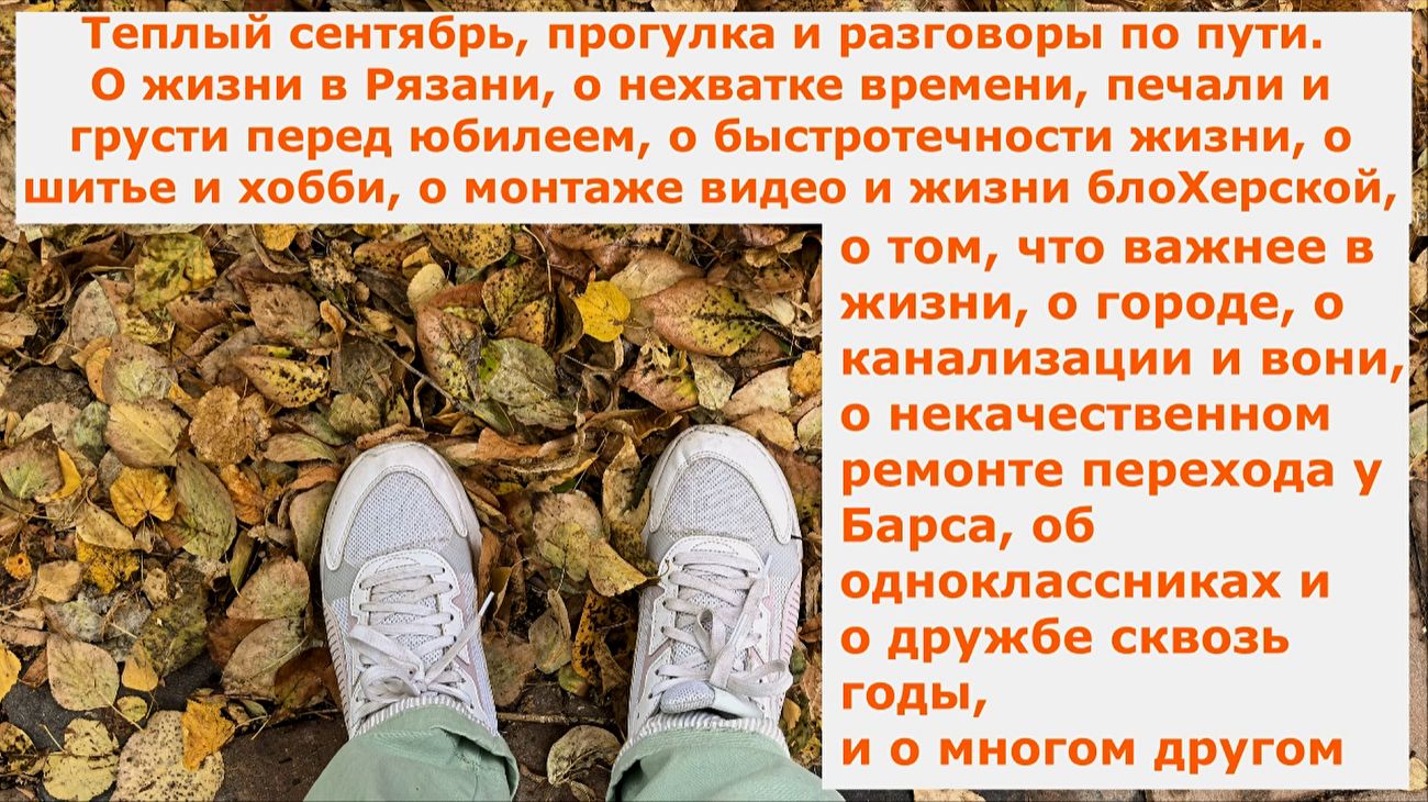 Теплый сентябрь 2025. Прогулка и разговоры по пути о жизни в Рязани, о нехватке времени, печали и грусти перед юбилеем, о быстротечности жизни, о шитье и многочисленных любимых хобби, о монтаже видео и жизни блоХерской, о том, что важнее для меня в эттой жизни. О городе, канализации и вони, о некачественном безобразном ремонте перехода у Барса, о самокатах и самокатчиках, о погоде, об одноклассниках и дружбе более 42 лут плюс 10 школьных лет, и о много многом другом по пути. Магаданцы в Рязани. Жизнь магаданцев в Рязани https://youtube.com/playlist?list=PLOXFdJn8xE45niyZYWNNt98g4rPCZAtCO&si=nVRqlQ3FwEpPjuX1 Изучаем Рязань https://youtube.com/playlist?list=PLOXFdJn8xE447Ow64A6jm_pMN3VsPw-sM&si=Cgx02FO3kR9kBxBm Наши пенсионерские путешествия https://youtube.com/playlist?list=PLOXFdJn8xE45WRX3lLoqOtiW-UpgZY3UK&si=BJspZKHR-v2bwad5 Дачные хлопоты https://youtube.com/playlist?list=PLOXFdJn8xE46sLEbTc3UE61Kd2ZHCLiQa&si=6aey0Qoa7GxN8oCU Мой Магадан https://youtube.com/playlist?list=PLOXFdJn8xE45ECLh-BZsmazbk73IDlRQZ&si=6_ccHwKdAX9IZKbX Мои куклы https://youtube.com/playlist?list=PLOXFdJn8xE45fcSFtp4toJiXn2R8Qd3GX&si=M6QcXjlDmp4ShpG9 Мое шитье и творчество https://youtube.com/playlist?list=PLOXFdJn8xE4772vwWgX8SOxNi6QY0HiI7&si=DztFlRQLQSTYEdYN Как смотреть ютуб в России без впн с ноута, я не раз рассказывала в своих публикациях в ВК (ссылки на страничку ниже или просто поставьте расширение бесплатное фастпрокси на яндекс браузер или гугл хром и делов то!) *********************************************************************** Если желаете поблагодарить меня за мою работу, поддержать мой канал и мое хобби - карта Сбербанк: 2202 2067 0645 4373 - буду очень признательна всем, кто ценит этот нелегкий труд! QR-код для перевода онлайн Сбербанк в конце каждого видео. Спасибо за любую поддержку! С уважением, Анжелина. ************************************************************************* У КОГО НЕ РАБОТАЕТ ЮТУБ В РОССИИ: ✅Канал рутуб home.strannik-j.org/.../26492427/ ✅Дзен dzen.ru/...f53aef1fff... ✅Все видео ВКонтакте vk.com/club226856756 / @anzhelina_jolie_ ✅Моя творческая мастерская в ВК vk.com/...c212000538 ✅Играю в куклы в ВК vk.com/club224828421 ✅Готовим с Джоли в ВК vk.com/club223193761 ✅Телеграмм для общения подписчиков и друзей Анжелина&Компания t.me/...N1Kd0zOTg6 - группа закрытая, стучаться! ✅Телеграмм новостной со ссылками на все публикации t.me/...osim_chaim ✅Телеграмм Шьем с Анжелиной Джоли t.me/sewing_jolie ✅Телеграмм МИР КУКОЛ t.me/...mld4yh_y8d ✅Телеграмм Мода/стиль/идеи/шитье t.me/...dei_sewing ✅Мои публикации на бейбиках про кукольное хобби babiki.ru/...akharchuk/... ✅Основной ютуб www.youtube.com/...ryazan/vid.. ✅Ютуб Шьем с Анжелиной Джоли www.youtube.com/...ie_/videos Кому нравятся мои путешествия и видео-прогулки по разным городам, моя незатейливая кулинария, мое шитье и куклы, видео релакс о нашей дачке и мой жизненный настрой и позитив, которым я делюсь с другими - Я ОЧЕНЬ ЭТОМУ РАДА!
