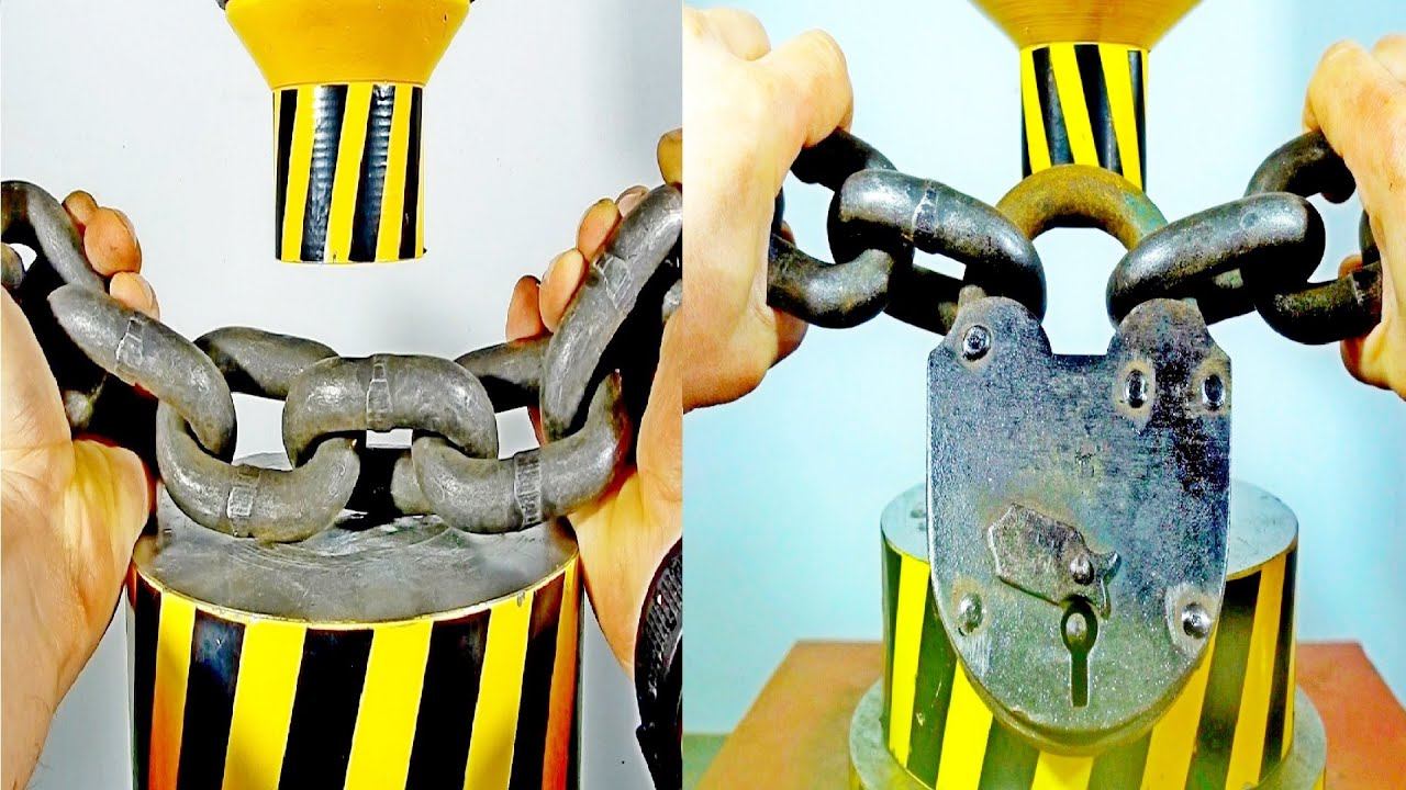 We will test the strength of a strong chain and lock with a hydraulic press