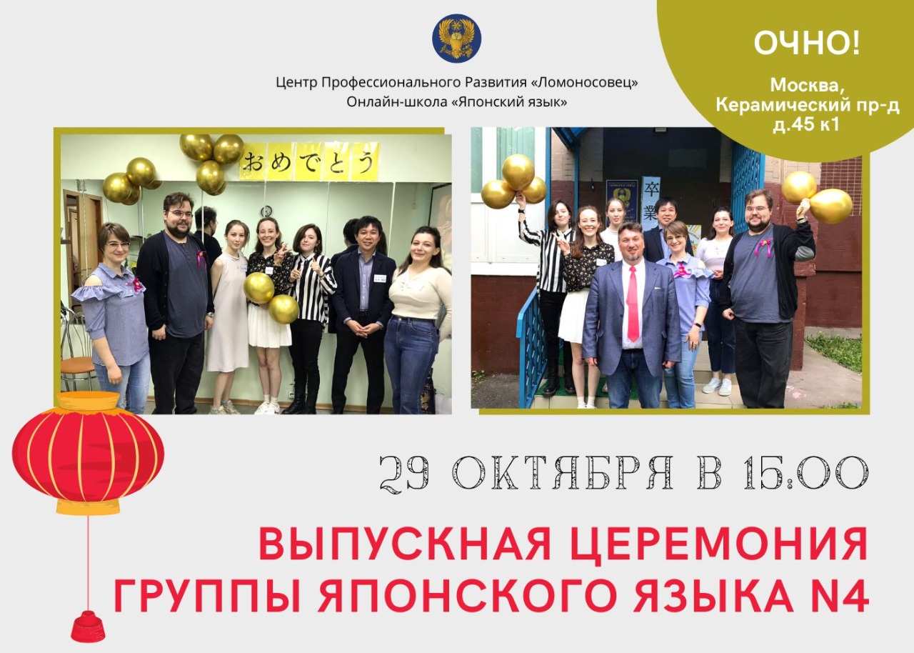 みなさん、こんにちは Привет! ? 29 октября в 15:00 в центре «Ломоносовец» состоится выпускная церемония группы японского языка на N4 ? Приглашаем всех желающих! ? ⚡В программе: ?Выступления выпускников ?Вручение сертификатов ?Поздравительная речь директора и сотрудников школы ?Кулинарный мастер-класс «Ичиго дайфуку» ?Игра в крокодила на японском ?Игра «Угадай, кто ты» на японском ?Чаепитие в дружном семейном кругу ?Запуск фонариков Ждем вас! ? Запись по телефону: ?+7 495 505 03 54 ⚡Количество мест ограничено!