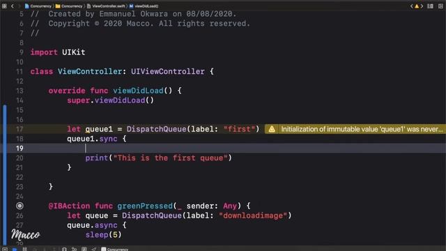 Today we learn about Concurrency and how we can improve our app's performance by applying it. We learn the difference between Synchronous and Asynchronous programming and also identify scenarios where each of them can be used. Next, we talk about the Main Queue, the dangers of blocking it, and how to create and manage concurrent queues using the Grand Central Dispatch (GCD). Afterwards, we look into DispatchGroups and how we can use it to wait for the completion of all queues before executing an action. Finally, we talk about the Quality of Service (QOS) outlining the various priority levels and when they might be used. Say Hi on Social Media: LinkedIn: https://www.linkedin.com/in/emacco/ Twitter: https://twitter.com/Its_Macco Additional Resources: https://www.freecodecamp.org/news/ios-concurrency/