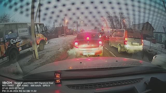 Движение рейсовых автобусов по встречной обочине. г.Абакан по ул.Гоголя в рабочие дни с утра.