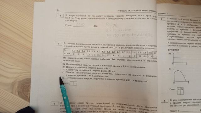 ЕГЭ по физике 2020 типовые экзаменационные варианты. 30 вариантов. Вариант 1. Задание 5. В таблице представлены данные о положении шарика, прикреплённого к пружине и колеблющегося вдоль горизонтальной оси Ох, в различные моменты времени.Из приведённого ниже списка выберите два верных утверждения о характере движения тела. 1) Кинетическая энергия шарика в момент времени 1,0 с максимальна. 2) Период колебаний шарика равен 4,0 с. 3) Амплитуда колебаний шарика равна 30 мм. 4) Полная механическая энергия маятника, состоящего из шарика и пружины, в момент времени 3,0 с максимальна. 5) Потенциальная энергия пружины в момент времени 2,0 с минимальна. Решение. 1) Нет. Кинетическая энергия максимальна, когда шарик проходит свой равновесный уровень, т.е., например, в момент t=0 с. 2) Да. Период колебаний – это время одного полного колебания в секундах. Из таблицы видно, что половина периода (например, два нуля подряд по оси x) равна 2 с, значит, полный период равен T=4 с. 3) Нет. Амплитуда колебаний – это наибольшее отклонение от равновесного состояния. По таблице это значение равно 15 мм. 4) Нет. Полная механическая энергия маятников неизменна на всем протяжении их незатухающих колебаний. 5) Да. В момент t=2 с шарик проходит свой равновесный уровень, в котором потенциальная энергия минимальна, а кинетическая – максимальна. Ответ: 25.