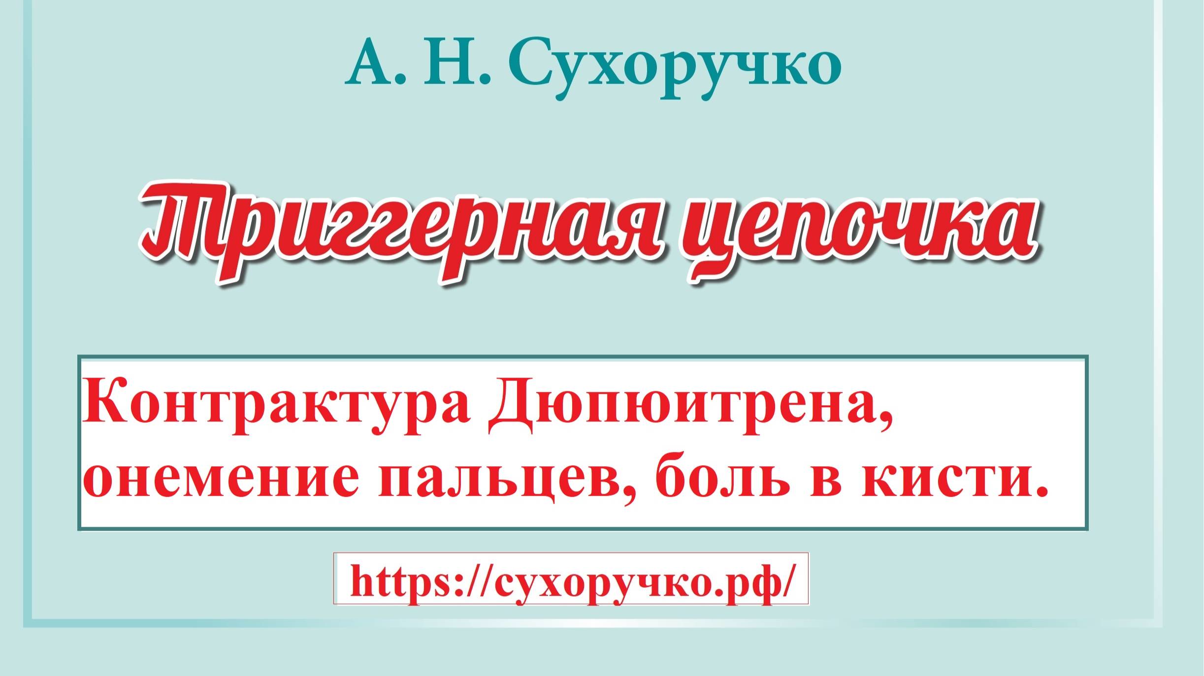 Контрактура Дюпюитрена, онемение, боль в кисти. "Триггерная цепочка" Сухоручко А.Н. - это русская инновация оздоровления организма, без: неврологии, лекарств, МРТ, УЗИ, нейрохирургии, остеопатии, мануальной терапии, костоправства, тренажёров. Триггерная цепочка устанавливает диагноз, определяет тактику оздоровления и профилактики; устраняет боли, головокружение, онемение; восстанавливает и укрепляет работу позвоночника, суставов; вертикализирует осанку. Почувствуй легкость, энергию, силу — без мигрени, грыжи диска, остеохондроза, невралгий, артроза, сколиоза, панической атаки! Подробней читать в книге А.Н. Сухоручко "Триггерная цепочка. Энциклопедия здоровья позвоночника и суставов" / сайт сухоручко.рф