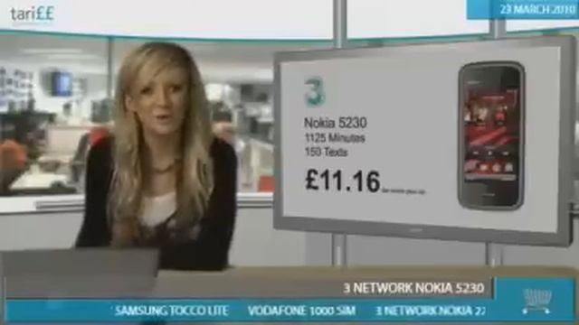 Hello I'm Bryony and if you want a great deal on minutes and texts that won't break the bank then I might have just the deal for you-only available at Tariffsupermarket.com. Now, with this great offer on the 3 Network you get a staggering 1125 minutes to use as and when you need them-whether you love chatting to your friends and family, partner or work colleagues. With that many minutes to use every month, you'll be chatting for hours! But you might need some texts as well, so with this deal you get 150 of them at your disposal each and every month. Now, you're thinking this sounds great but I need a phone as well-that's no problem, with this fantastic offer you get a free stunning Nokia 5230 handset! The RRP for this deal is £25.53p per month, but today here at Tariffsupermarket.com you pay just £11.16. That's a saving of nearly £350 over the term of the 24 contract.. that's amazing.. ..And that's a deal!!