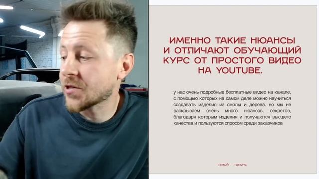 Вебинар будет доступен ТОЛЬКО 24 ЧАСА, далее доступ будет только по ссылке, сохраняйте ссылку если планируете посмотреть позже. Полезный бесплатный вебинар, после которого вы узнаете: - какие актуальные направления в столярной мастерской. Что пользуется повышенным спросом у клиентов - видео мастер-класс “Как создать стол из смолы и дерева” - ТОП 9 способов заработка на изделиях из эпоксидной смолы и дерева. Как выделиться среди конкурентов - как в 2024-2025 году создать свою столярную мастерскую и вывести её на стабильную прибыль от 200.000 рублей. Что необходимо для этого - презентация нашего первого Большого Лихого курса: смола, дерево и бизнес с нуля - ответы на ваши вопросы присоединиться к большому лихому курсу по специальной цене вы можете через сайт: http://courselihoy.tilda.ws/likhoycourse Если у вас есть вопросы по обучению, вы можете написать в отдел заботы: https://t.me/lihojtoporschool