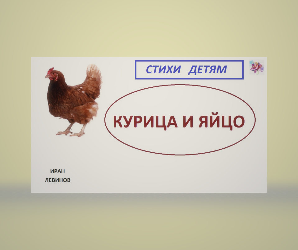 Левинов Иран. В этом видео красочно, просто и интересно для детей изложен спор курицы и яйца, о том кто первый появился на свет, курица или яйцо Стихотворение учит детей размышлять, фантазировать, понимать, как проходит жизнь животных, чем питаются домашние и лесные животные и птицы, какой образ жизни ведут. Приучают не бояться животных. Стихотворение улучшает настроение, отвлекает от проблем, успокаивает ребёнка. Стих помогает размышлять, решает детские проблемы. Помогает родителям в воспитании детей.