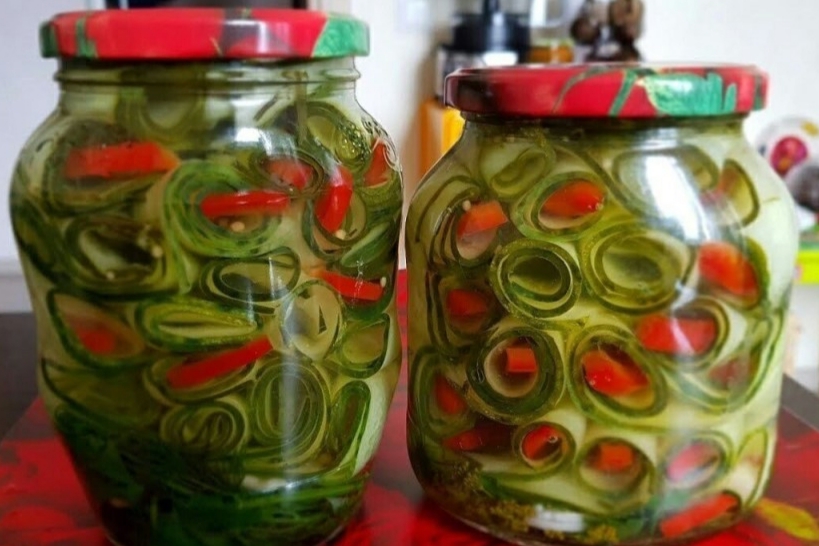 1. Огурцы - 1,5 кг. 2. Болгарский перец - 4-5 шт. 3. Чеснок - в каждую банку по 2 зубчика. 4. Чёрный перец горошком - в каждую банку по 3-4 шт. 5. Уксус 9% - в каждую банку объёмом 700 мл. 2 ст. ложки, а в 500 мл 1,5 ст. ложки. Маринад: 1. Крутой кипяток - 1,5 литра. 2. Соль - 1,5 ст. ложки. 3. Сахар - 3 ст. ложки. Выход: 3 банки объёмом 700 мл. можете добавить зелени - укроп и петрушку.