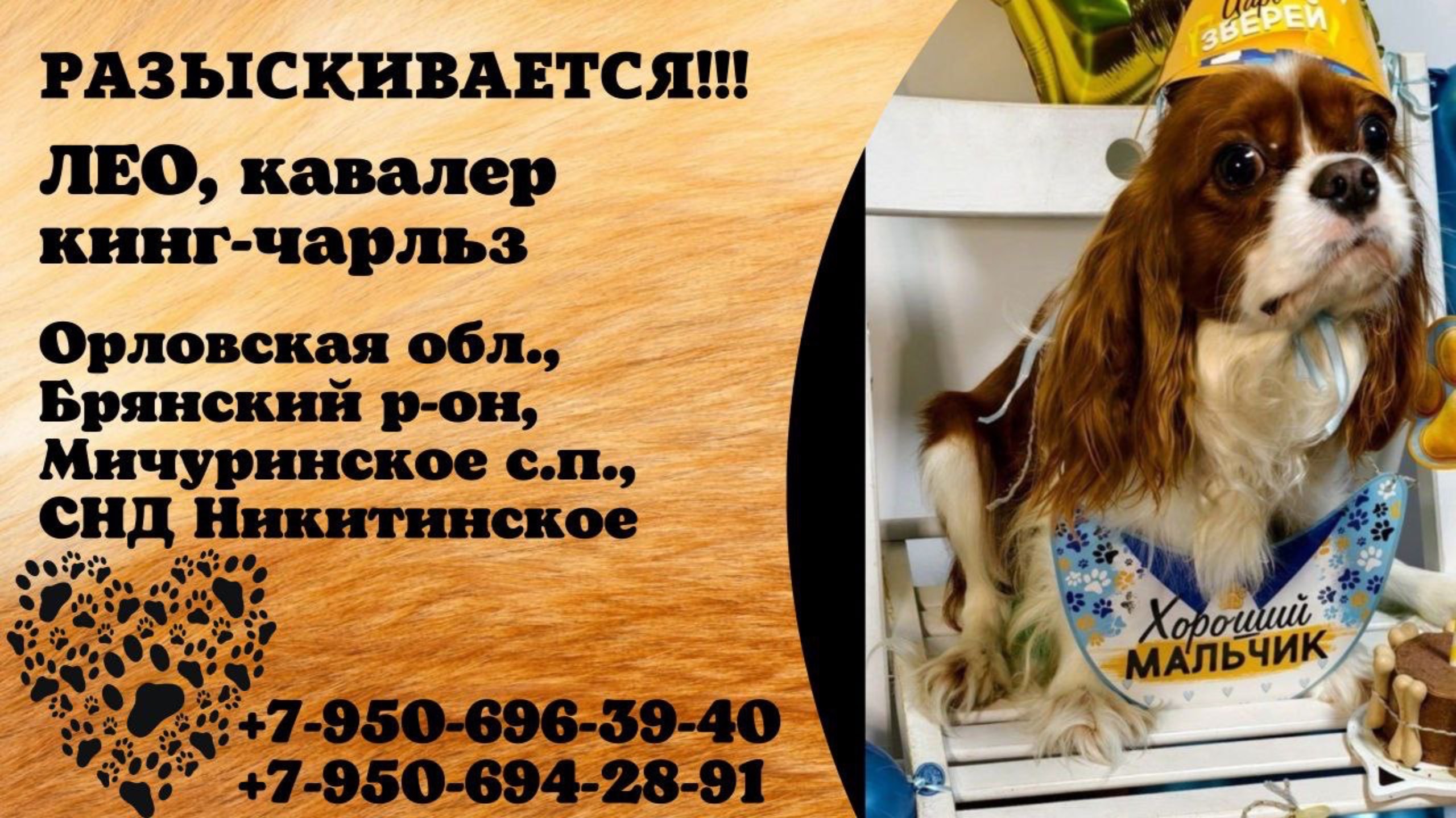 Орловская Орел Пропала собака ПОТЕРЯЛАСЬ СОБАКА по кличке ЛЕО! В ночь 10.06. Не теряем надежды 🙏 По адресу СДТ Никитинское (Мичуринское сельское поселение, Брянский район),возможно уже в другом городе или районе. ЕСЛИ вы увидели похожего у кого-то🙏 сфотографируйте, снимите на видео, свяжитесь с нами. ❌Собаке необходима постоянная, медицинская помощь❌ Порода ковалер кинг-чарльз спаниель, мальчик. Откликается на имя Лео. - Окрас коричневый (рыжий) с белым. - Есть небольшое пятнышко слева на мордочке (как родинка, точка). - На голове белое пятнышко в виде сердечка или галочки. - Был в ошейнике коричневого цвета. ВОЗНАГРАЖДЕНИЕ 100.000р, АНОНИМНОСТЬ ГАРАНТИРУЕМ! Тел. +7 (950) 696-39-40, Мария Тел. +7 (950) 694-28-91, Владислав Инфо https://vk.com/wall-198815410_202309 #пропала_собака#орел