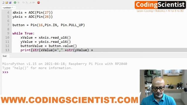 In this lesson I will show you how to connect a Joystick to your Pico and write several lines of MicroPython code to start reading the values sent through the Joystick control. Wire the joystick’s 5 pins to the Pico as follows: • GND to GND (Any GND pin) • +5V to 3V3 Out (physical pin 36). Yes, a 5V joystick will work with the 3V3 power of Pico. • VRx to GP27 / ADC1 (physical pin 32) • VRy to GP26 / ADC0 (physical pin 31) • SW to GP16 (physical pin 21). This would work with most of the GPIo pins. An analog thumbstick is effectively three devices in one: a potentiometer for the X axis, a potentiometer for the Y axis and a digital momentary button when you press down. Below, we’ll write some simple code to help us see where the joystick is pointing. Project Source Codes : https://github.com/AnbuKumar-maker Contact us for more projects: info@codingscientist.com WhatsApp Support: +91-99725-77735 About us: https://www.codingscientist.com Hackster Community: https://www.hackster.io/anbu-kumar LinkedIn: https://www.linkedin.com/in/codingscientist/ Facebook: https://www.facebook.com/coding.scientist Twitter: https://twitter.com/robo_thoughts
