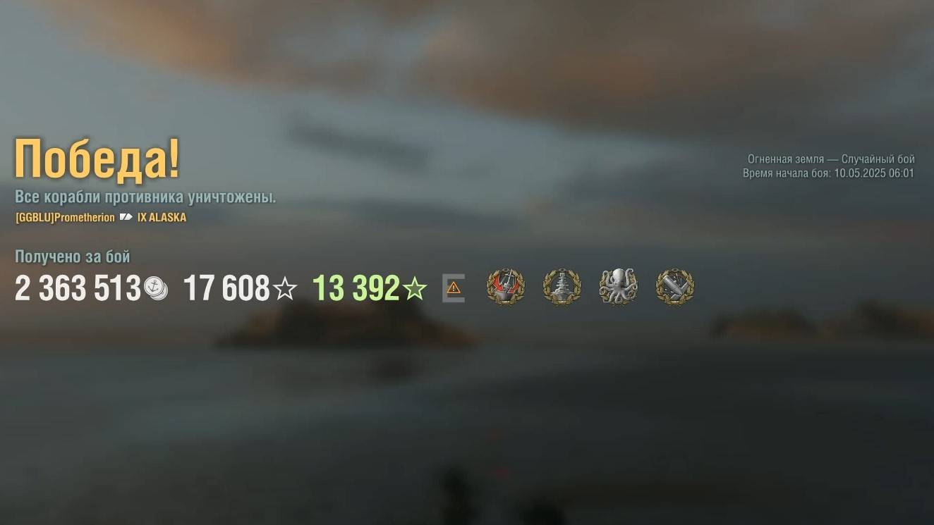 Крейсер Alaska. Игрок: Prometherion (ASIA). Карта: Огненная земля - Случайный бой. Урон: 200к. Alaska - Крейсер США 9 уровня.