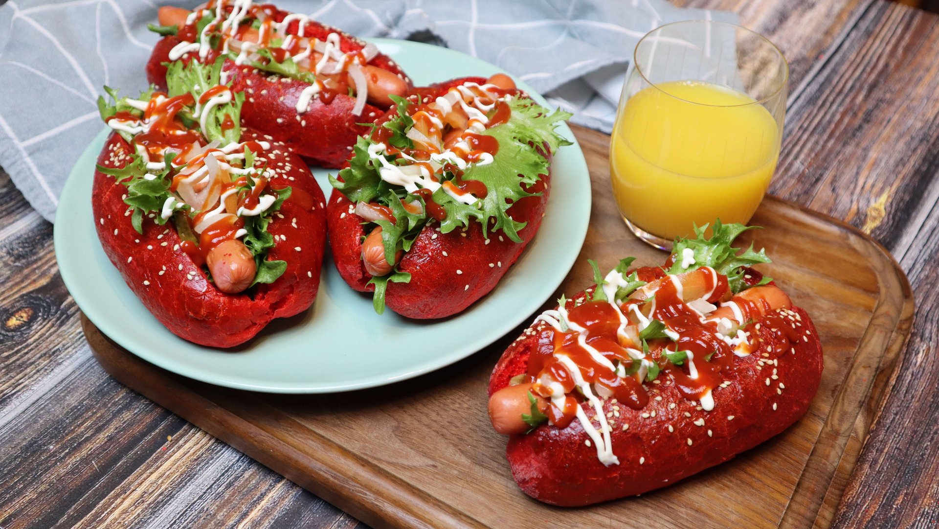 Все ингредиенты рассчитывайте от кол-ва порций, которые хотите сделать. Ингредиенты: Тесто: Мука Сахар Дрожжи Вода Соль Пищевой краситель Растительное масло. Начинка: Листья салата Жареная сосиска Маринованный или соленый огурец Помидор Лук репчатый Майонез, Кетчуп. В глубокую миску добавьте сахар, дрожжи, воду. Оставьте в теплом месте на 30 мин. Далее постепенно добавляйте муку и пищевой краситель, замешивайте тесто. Для того, чтобы тесто было податливым , можно добавить немного растительного масла. Обязательно посолите, я забыла =) Оставьте тесто на 1 час. Когда тесто подойдет, сделайте обминку. Сформируйте небольшие булочки. Смажьте их яйцом, посыпьте кунжутом и отправьте в духовку на 30-40 мин/180 °C. Для начинки я использую листья салата, жареные сосиски, маринованный огурец, помидор, лук, майонез, кетчуп. Вы можете добавить любые ингредиенты на свой вкус. Всем приятного аппетита! Готовьте с любовью и удовольствием #домашнийхотдог #готовимдома