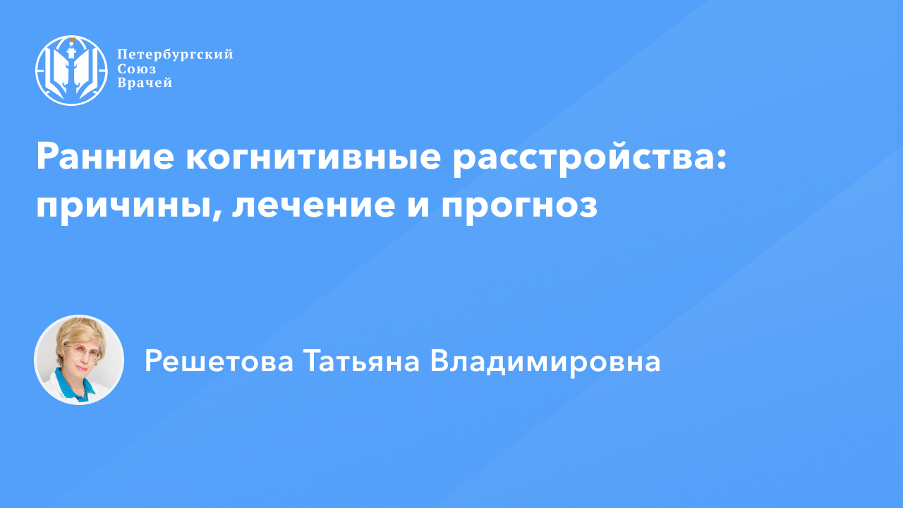 Видеозапись онлайн-семинара «Ранние когнитивные расстройства: причины, лечение и прогноз» Сайт: www.spb.doctor Дата проведения: 06.04.2023, 20:00 Страница мероприятия: https://spb.doctor/i/23031620/ Программа: 1. Ранние когнитивные расстройства: причины, лечение и прогноз. Решетова Татьяна Владимировна 2. Ответы на вопросы О семинаре: В онлайн-семинаре будут подробно рассмотрены пути формирования у пациентов ранних когнитивных расстройств, продемонстрированы клинические особенности их триггеров; рассмотрены вопросы клиники, дифдиагностики и лечения людей, страдающих когнитивными расстройствами при цереброваскулярных, дегенеративных, нарушениях, постковидном синдроме, с фокусом на имеющиеся возможности притормозить их прогрессирование. Будут подробно разобраны вопросы ранней экспресс-диагностики, патогенетической терапии различных видов когнитивных расстройств, представлены когнитивные и соматические признаки нейроковида, Будут освещены различные схемы терапии когнитивной дисфункции в континууме от легкого когнитивного расстройства до легкой деменции - наиболее частых в общей врачебной практике; проанализированы различные возможности психофармакотерапии и психологической коррекции, доступные врачу общей практики.